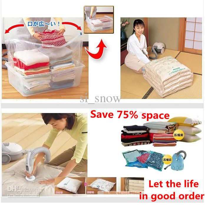 Seperti terlihat di foto, vacuum bag ini sangat cocok untuk kebutuhan penyimpanan Anda dan akan menghemat tempat hingga 75%, bahkan 80%.